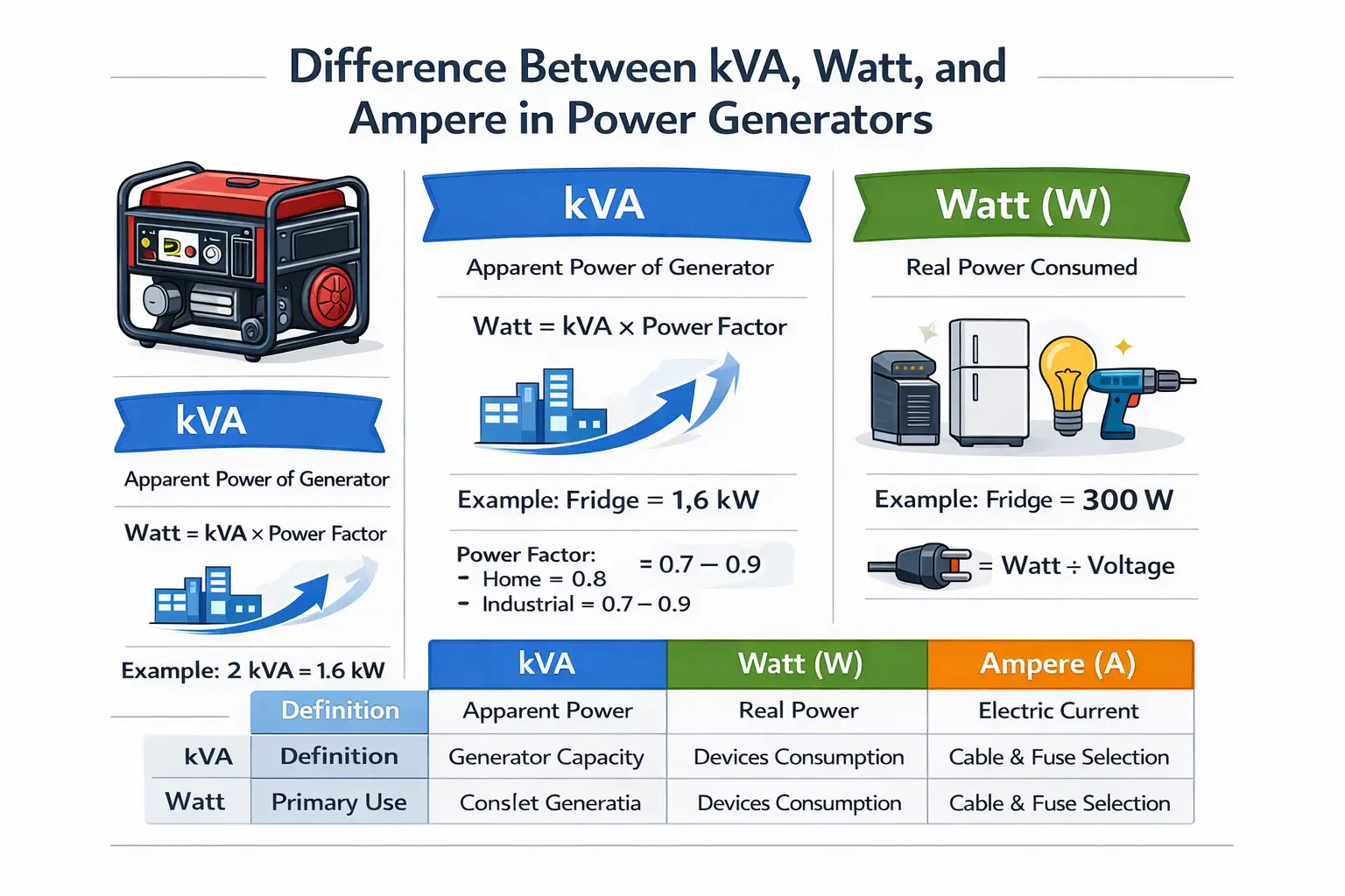 برای مصرف‌کننده، وات مهم‌تر است؛ اما هنگام خرید موتور برق، کاوا معیار اصلی ظرفیت ژنراتور است.